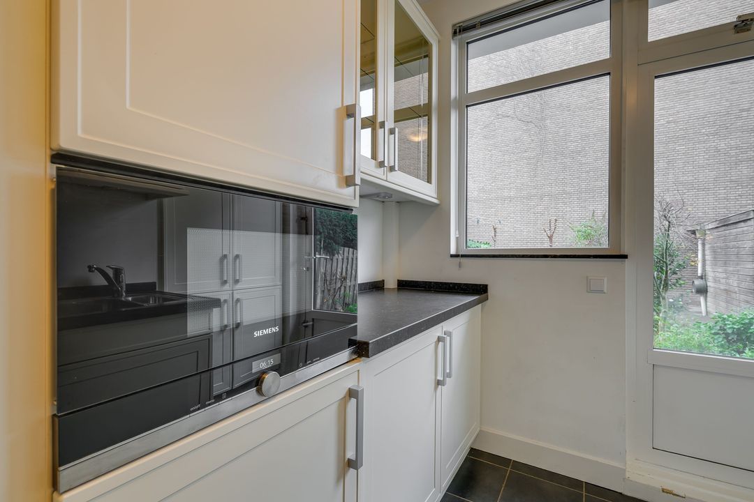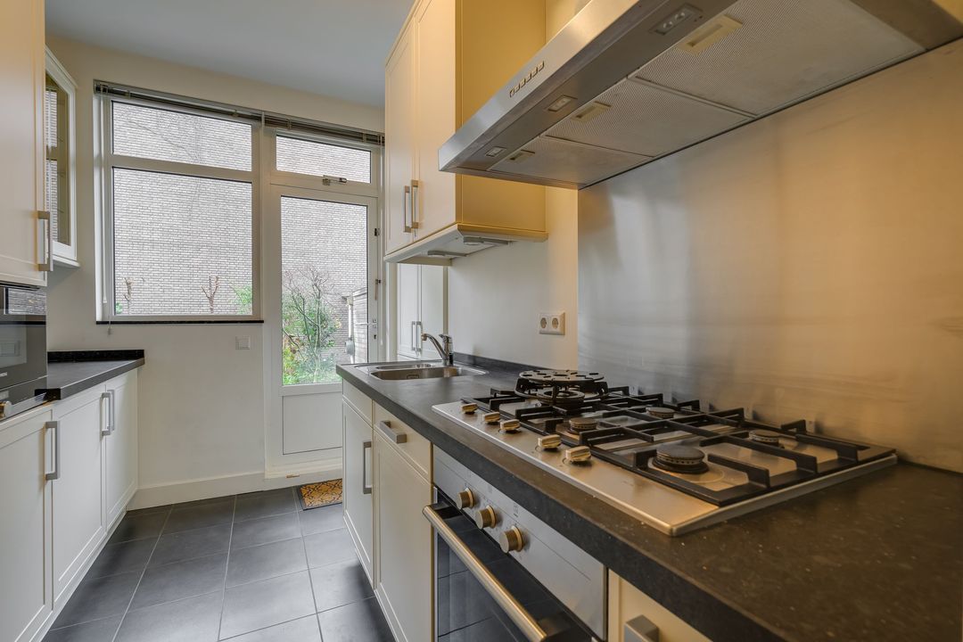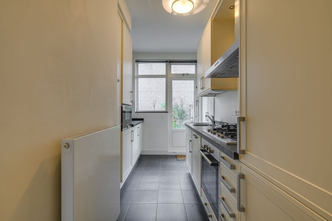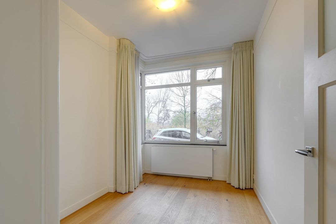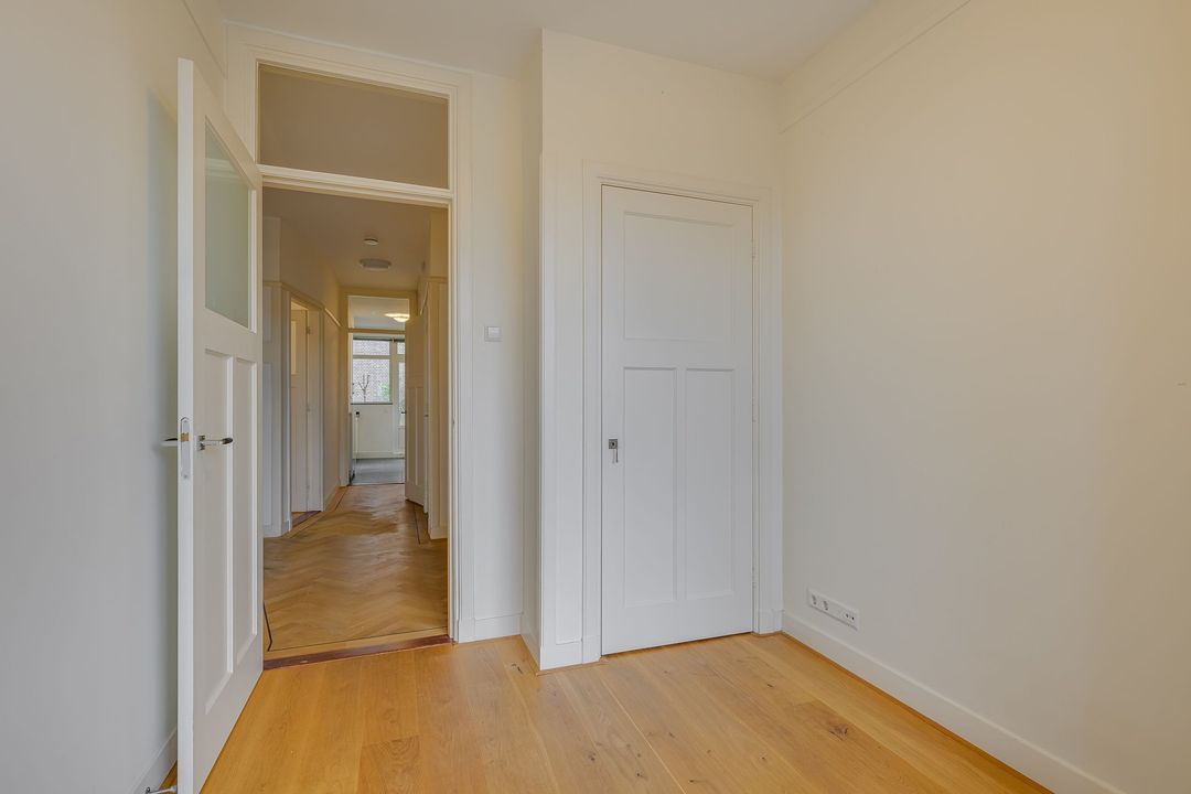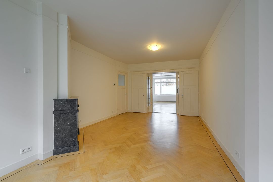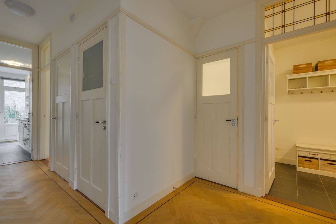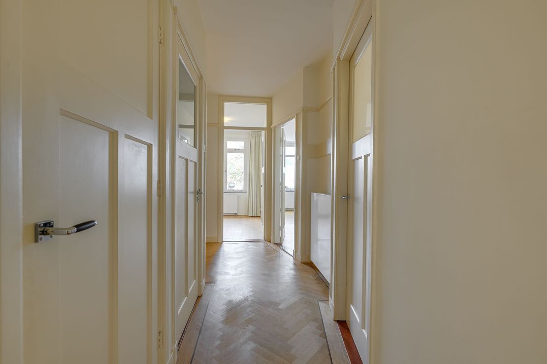 Ruime rentree, grote hal, zeer ruime voor- en achterkamer en suite (14.72x3.82) met fraaie visgraat parketvloer, originele schouwen en plafonds, suitekasten en schuifdeuren, voorzijkamer (3.46x2.46), modern betegeld toilet, ruime goed betegelde badkamer (3.01x2.20) met ligbad, separate douche en dubbele vaste wastafel, gangkast met w.m./droger aansluiting, moderne keuken (3.77x2.61/1.55) met mooi aanrechtblad en inbouw apparatuur zoals kookplaat met afzuigkap, oven, vaatwasser en koel/vriescombinatie, grote achter zijkamer (2.98/2.59x4.78).