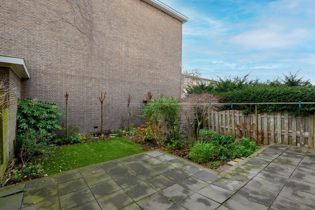 Grote brede zonnige achtertuin (10.50x8.60) op het zuidwesten met schuur.