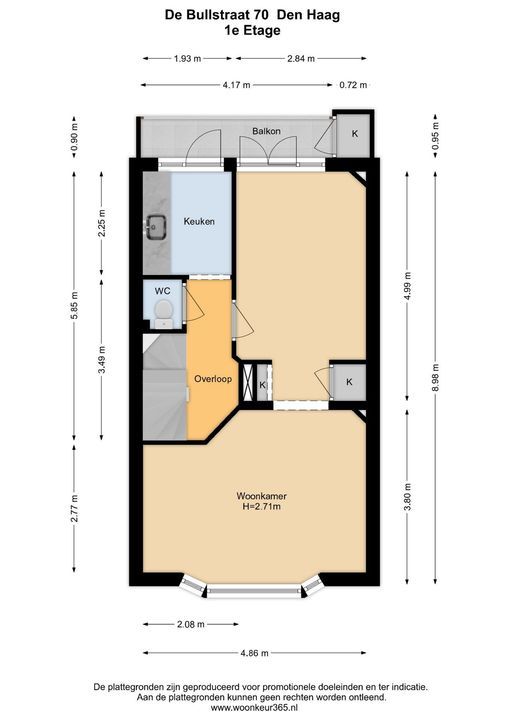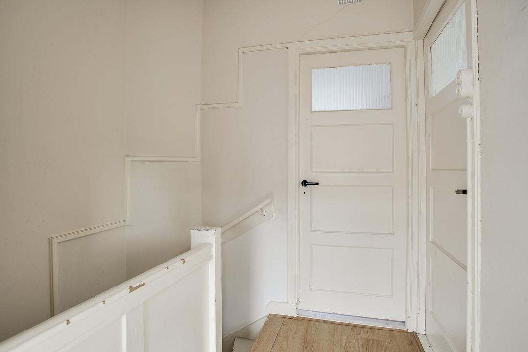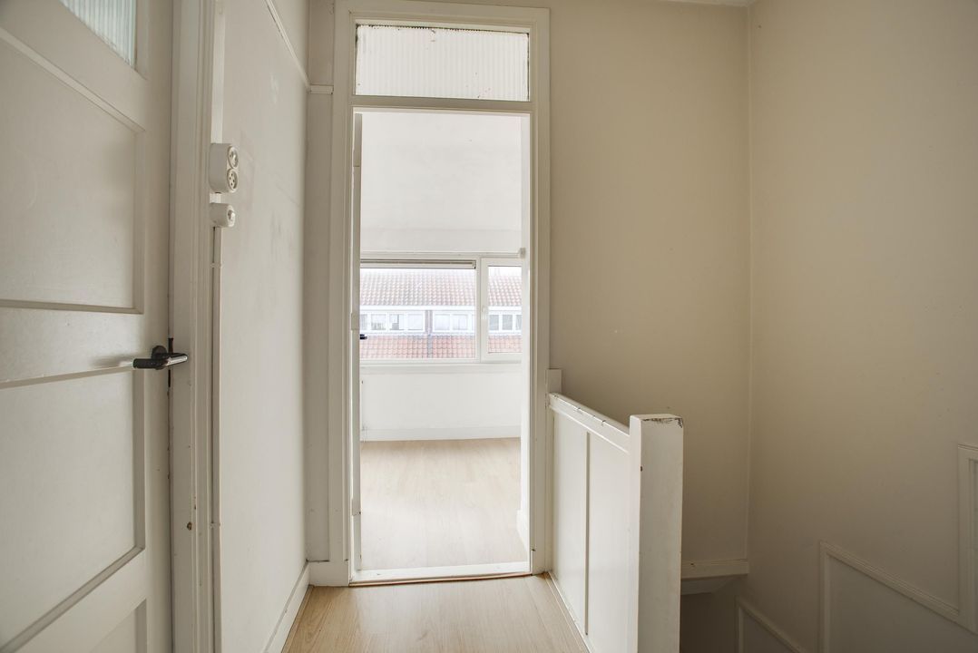trap naar 1e etage, overloop, met fontein, keuken 2.2x1.9 met eenvoudig keukenblok en de wasmachine aansluiting, voor- en achterkamer en suite kamer 4.8x3.8/2.8 en 5.0x2.85 (voorkamer is over de breedte van de woning), Achterbalkon 4.86x0.95 met balkonkast.