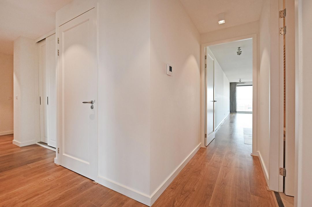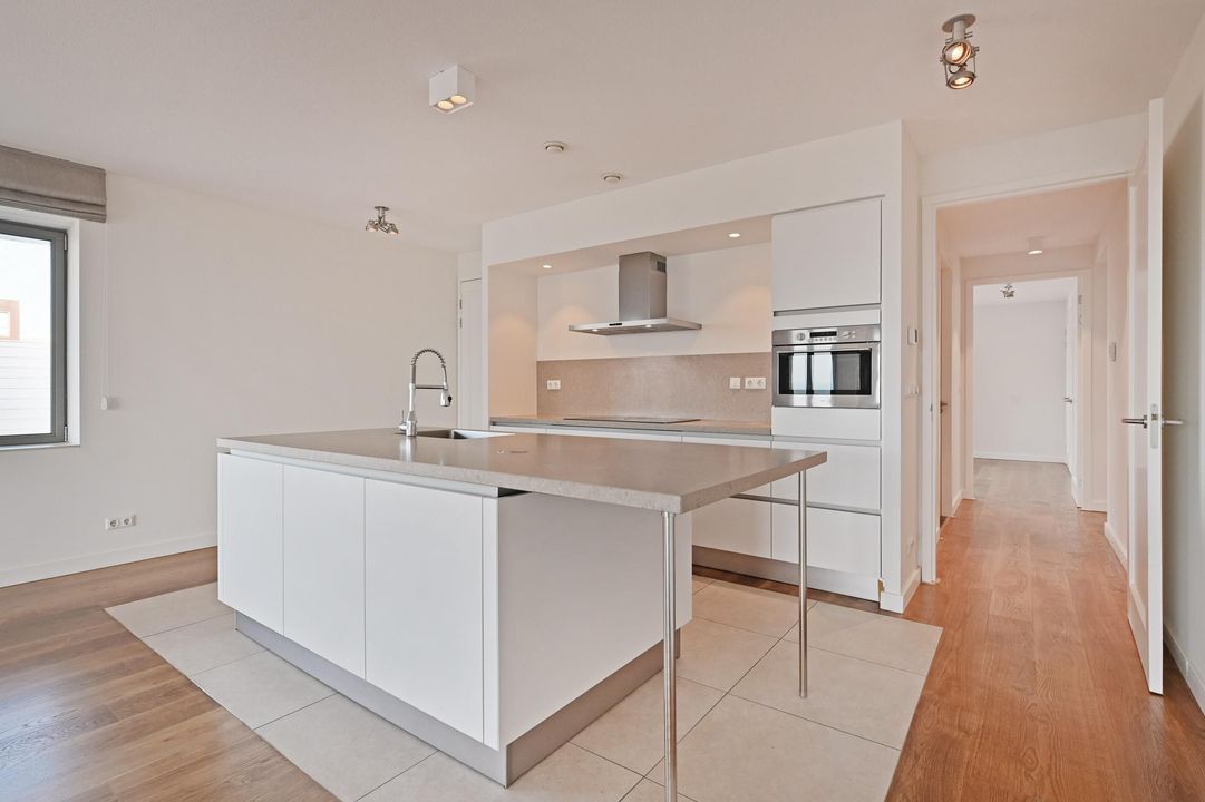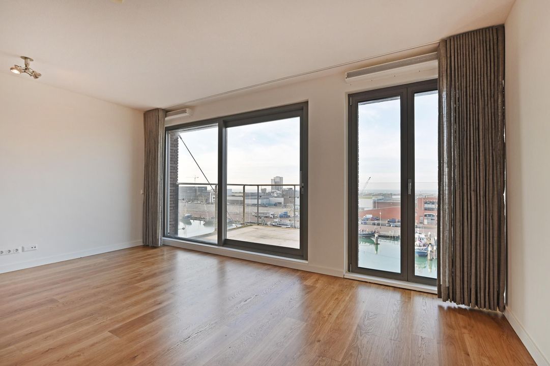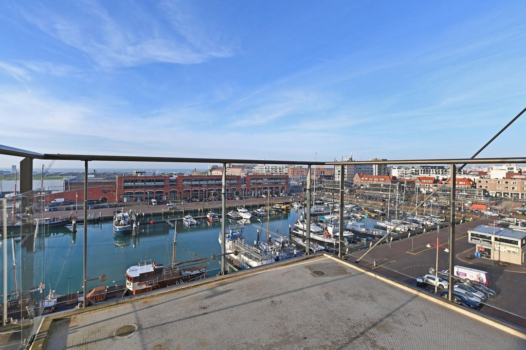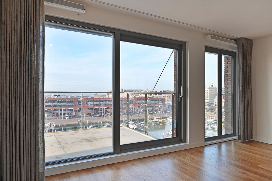 Gezamenlijke entree met lift en trappenhuis naar de 6e etage, entree van het appartement dat geheel is voorzien van vloerverwarming en een massieve houten vloer, L-vormige gang met meterkast, af te sluiten garderobe kast, toilet met hangcloset en fontein leidt naar de woon-/ eetkamer met open keuken en spoeleiland, te samen 10.5x5.3, een terras 2.7x2.8 met zeezicht en een bijkeuken 1.9x1.9. De woonkamer is 5.3 meter breed is heeft een groot zijraam met zicht op de restaurants aan de kopse kant van de haven en een schuifpui geeft toegang tot het terras waar u kunt genieten van de middag- en avondzon, de 2de binnenhaven en de Noordzee, terug in de woonkamer treft u de fraaie keuken bestaande uit het spoeleiland met stenenblad, de afwasmachine en gelegenheid om gezellig aan te schuiven, het keukendeel dat tegen de muur aan is geplaatst is voorzien van een 5-pits inductie kookplaat, een RVS afzuigkap, een combimagnetron en veel bergruimte, in de hoek naast de keuken is de toegang tot de bijkeuken met de wasmachineaansluiting en de Cv-ketel, aan de achterzijde liggen 3 kamers, te weten de hoofdslaapkamer 5.3x4.4 met meerdere grote ramen en een fraai uitzicht op de skyline van Den Haag en dus de ochtend zon, de open studeerkamer 4.35x2.3 met prachtige, op maat gemaakte boekenkast met bureau en de gasten kamer 4.35x3.0 met vaste kast, tot slot is er de ruime badkamer 3.1x2.0 en 2.0x1.0 met ligbad, een fraai wastafelmeubel, hangcloset en een ruime inloopdouche met regendouche.