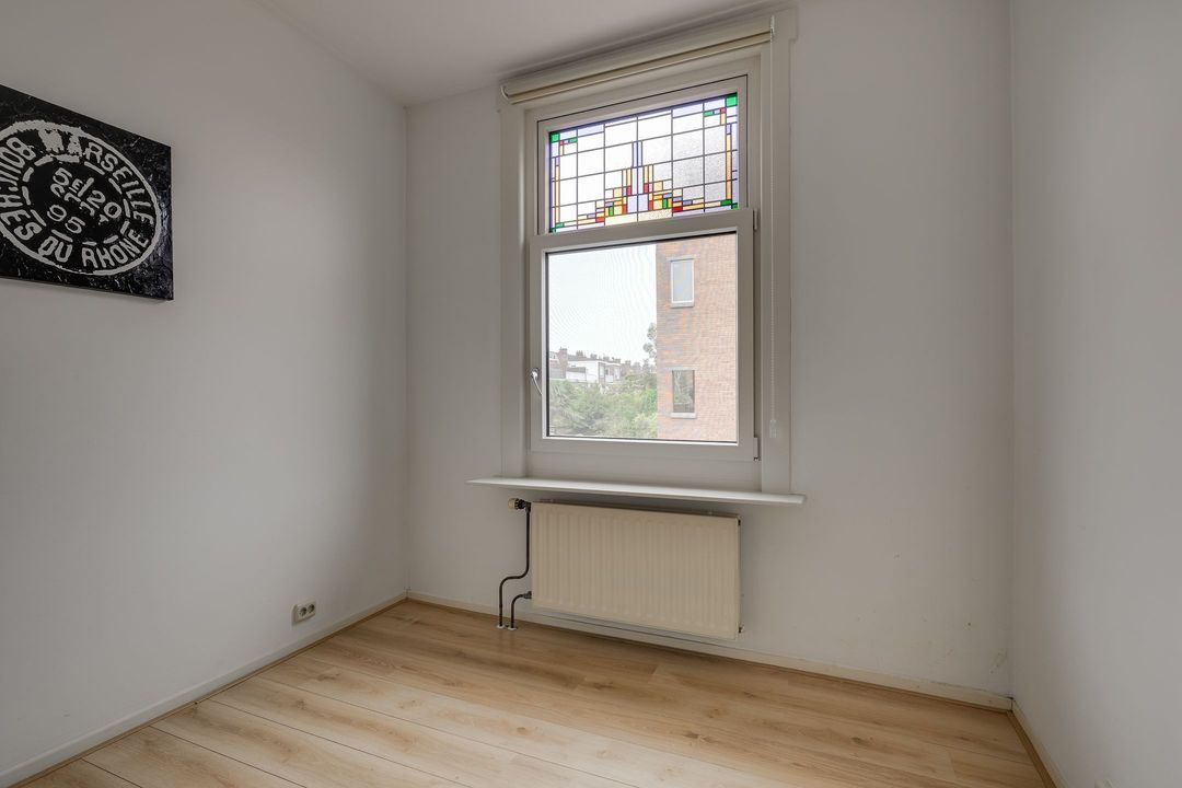 Eigen entree op de begane grond, trap naar de 1e etage: overloop, ruime doorgebroken woon-/eetkamer (9.5x3.6/4.3) met mooie laminaat vloer, kunststof kozijnen met dubbel glas waarin fraaie het glas-in-lood in is verwerkt, voorzijkamer (3.76x2.11), gangkast, modern toilet, badruimte (1.93x0.94) met douche en wastafel, ouderslaapkamer (2.84x3.59), moderne keuken (2.31/2.41x2.04) met enige inbouw apparatuur, achterbalkon (5.8x0.9) op het noordwesten.