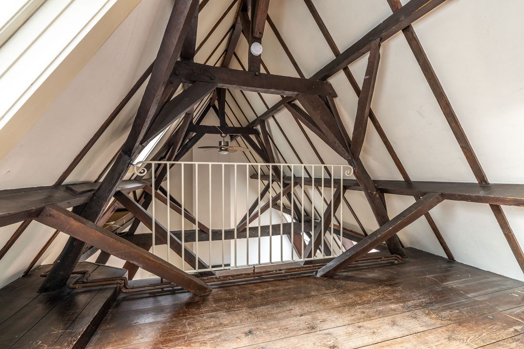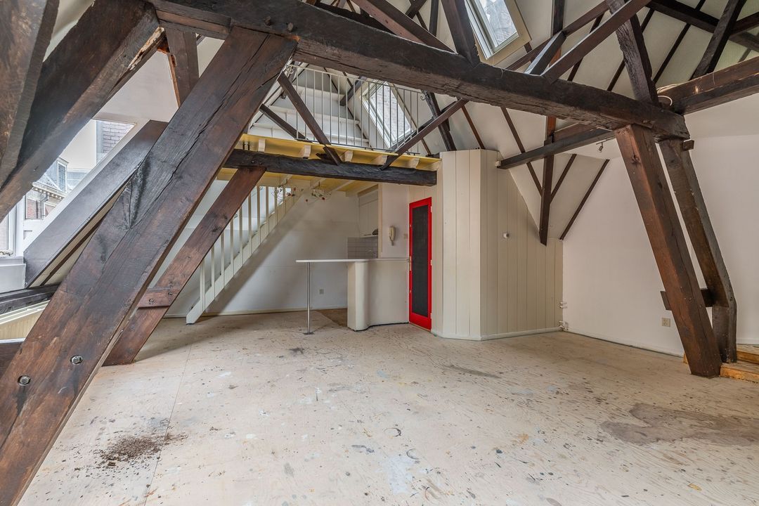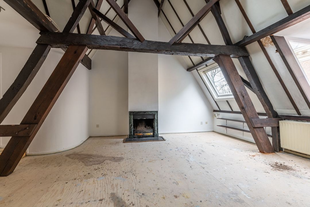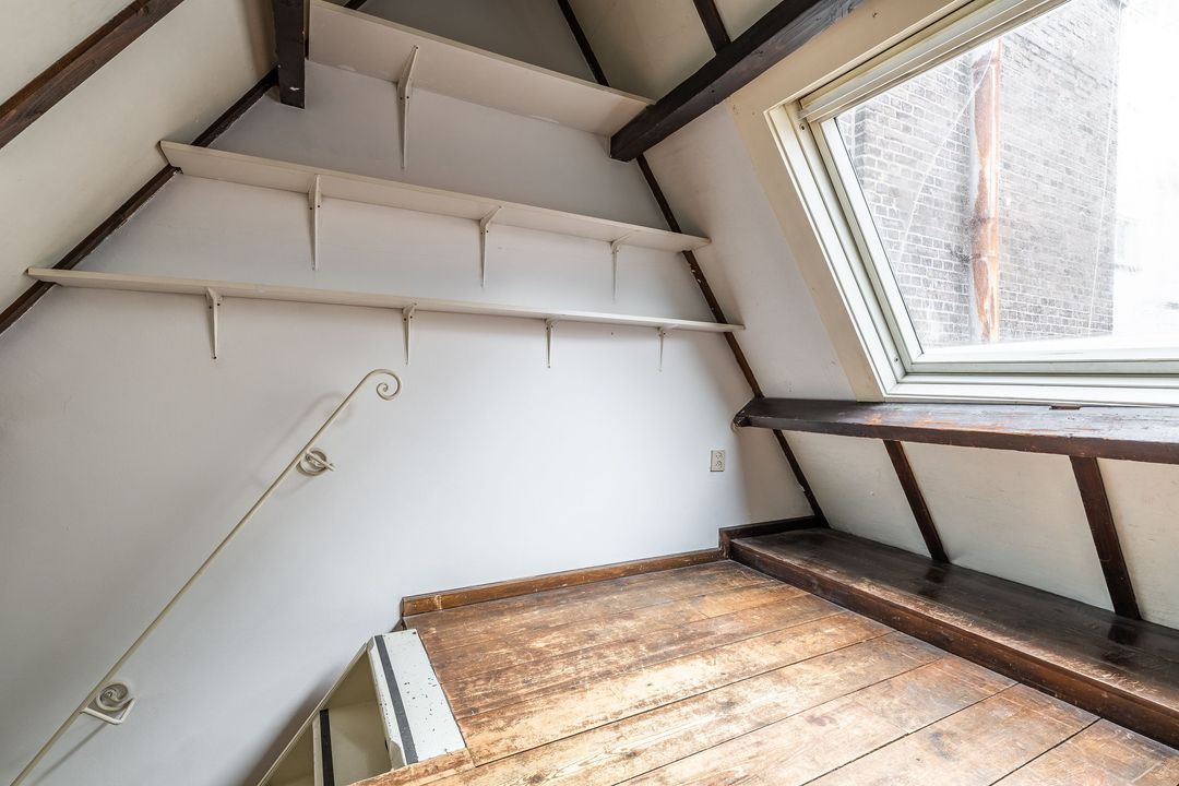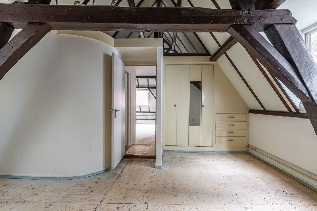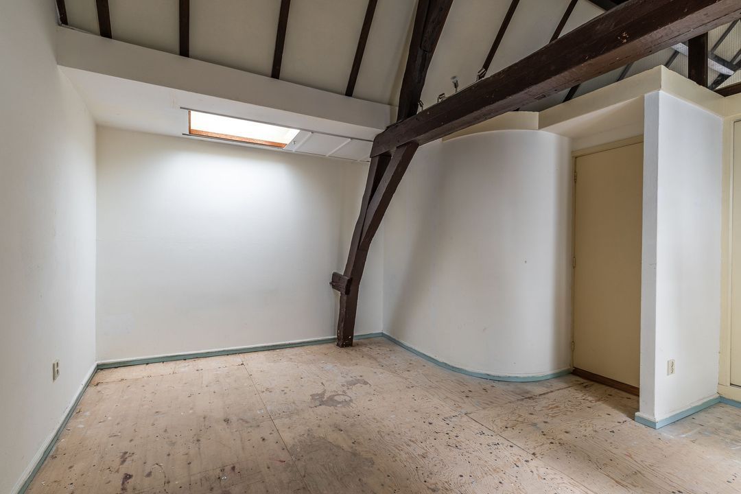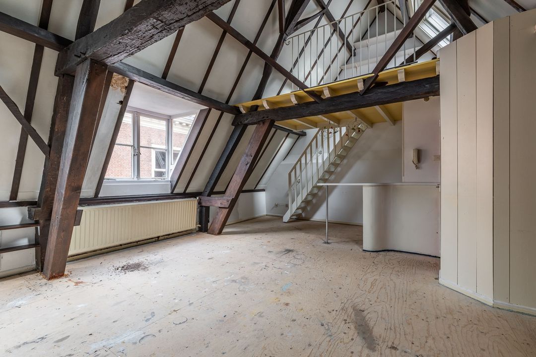 trap naar de 2e etage, grote woon/eetkamer (ca. 7.91x4.80/7.12) met eenvoudige open keuken en vaste trap naar entresol, zeer hoge kap (ca. 5.33m) en fraaie schouw, grote slaapkamer aan de achterzijde (4.91/2.97x4.86) met vaste kast, badkamer (3.07x1.74) met ligbad, toilet en wastafel. Geen buitenruimte