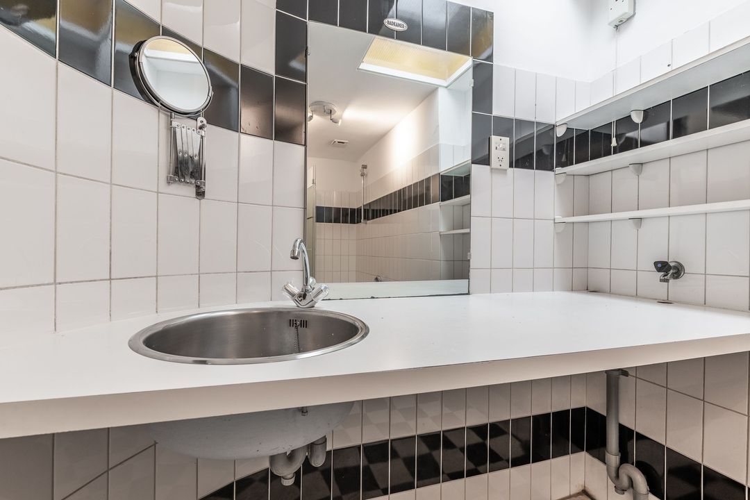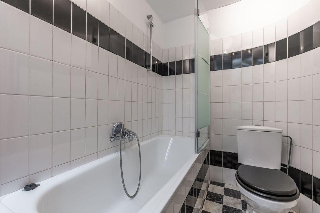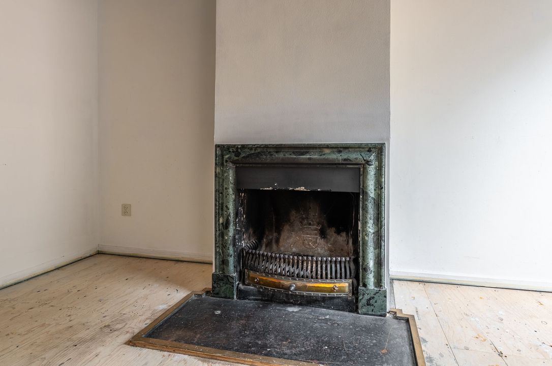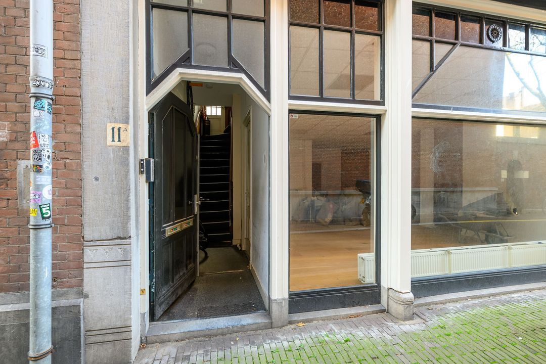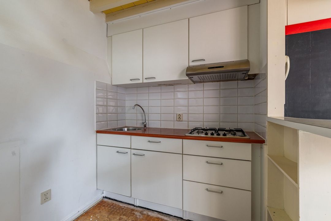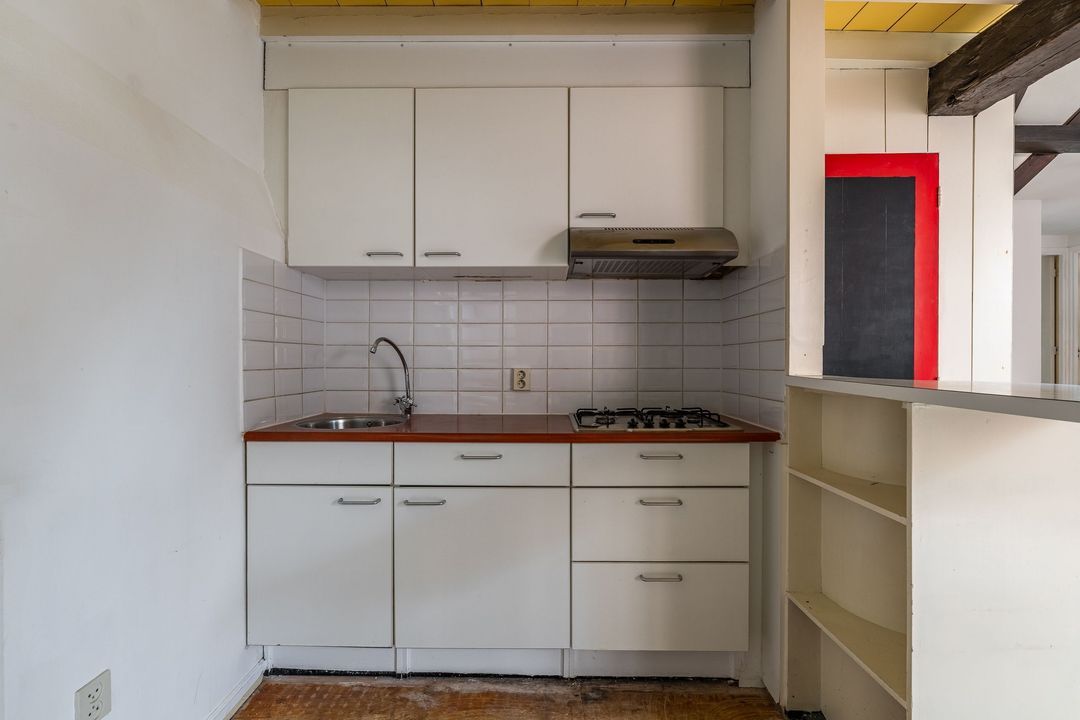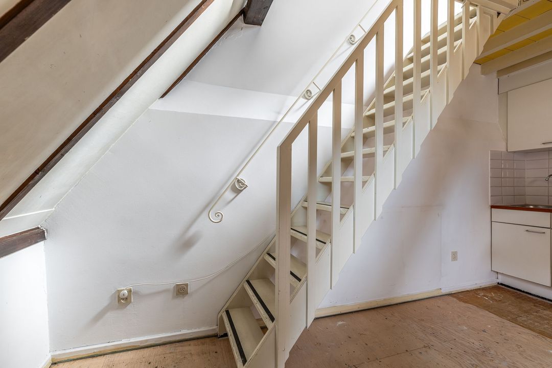 trap naar de 2e etage, grote woon/eetkamer (ca. 7.91x4.80/7.12) met eenvoudige open keuken en vaste trap naar entresol, zeer hoge kap (ca. 5.33m) en fraaie schouw, grote slaapkamer aan de achterzijde (4.91/2.97x4.86) met vaste kast, badkamer (3.07x1.74) met ligbad, toilet en wastafel. Geen buitenruimte