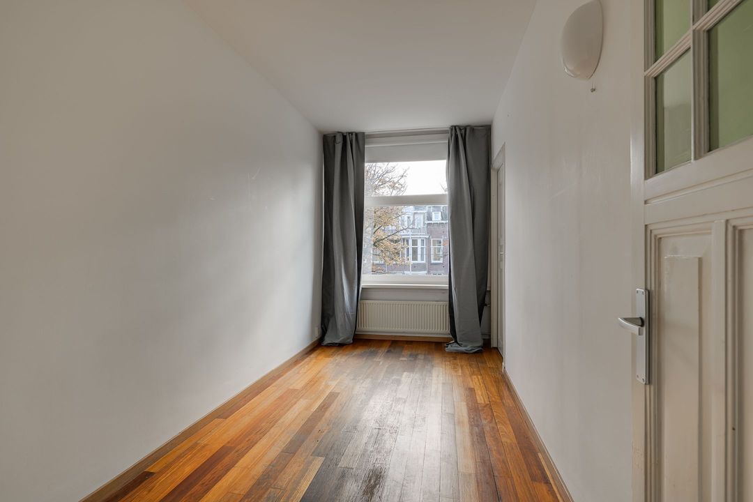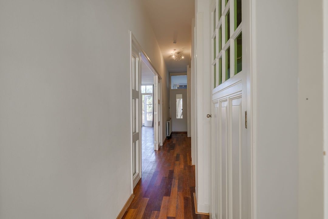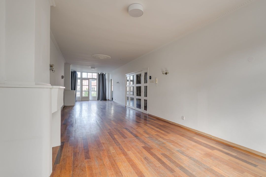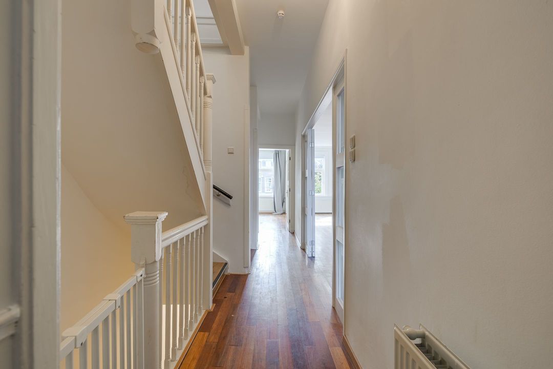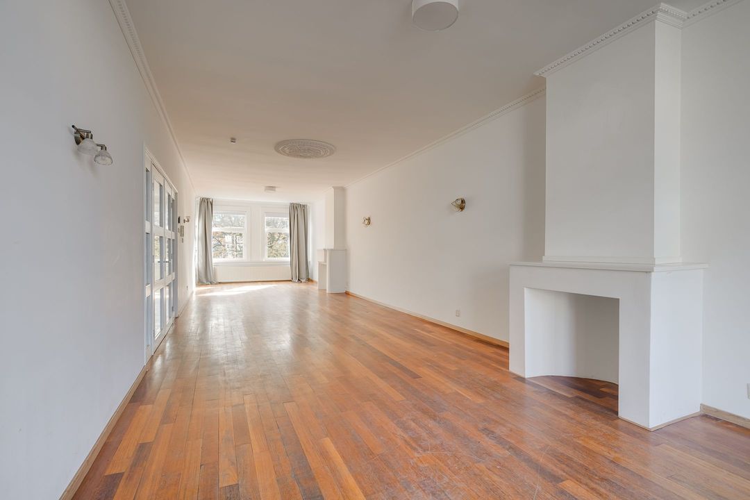 Entree via de voordeur; hal, binnentrap naar de eerste verdieping. Ruime overloop met royale doorgang naar de enorme woonkamer (14.21x3.80) met twee schouwen en mooie parketvloer. Aan de voorzijde uitzicht over de Laan van Meerdervoort, aan de achterzijde openslaande deuren naar het breed balkon (3.68x1.22) op het noordwesten.