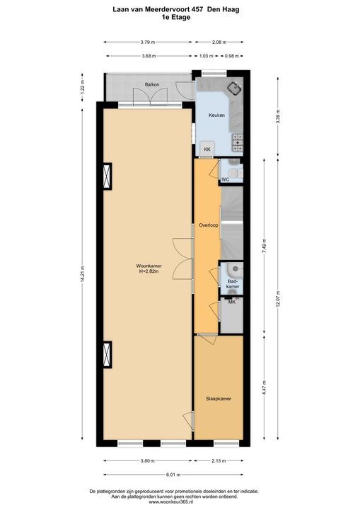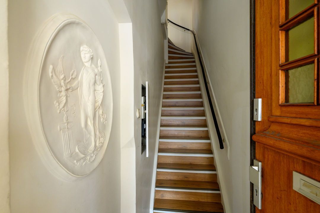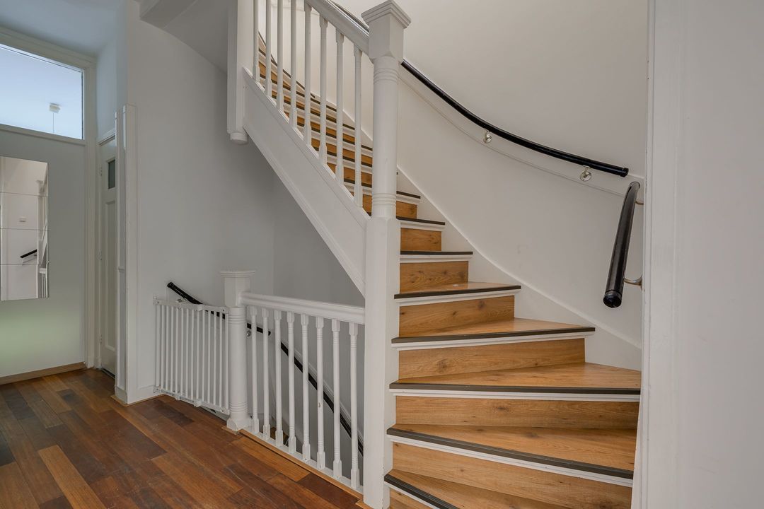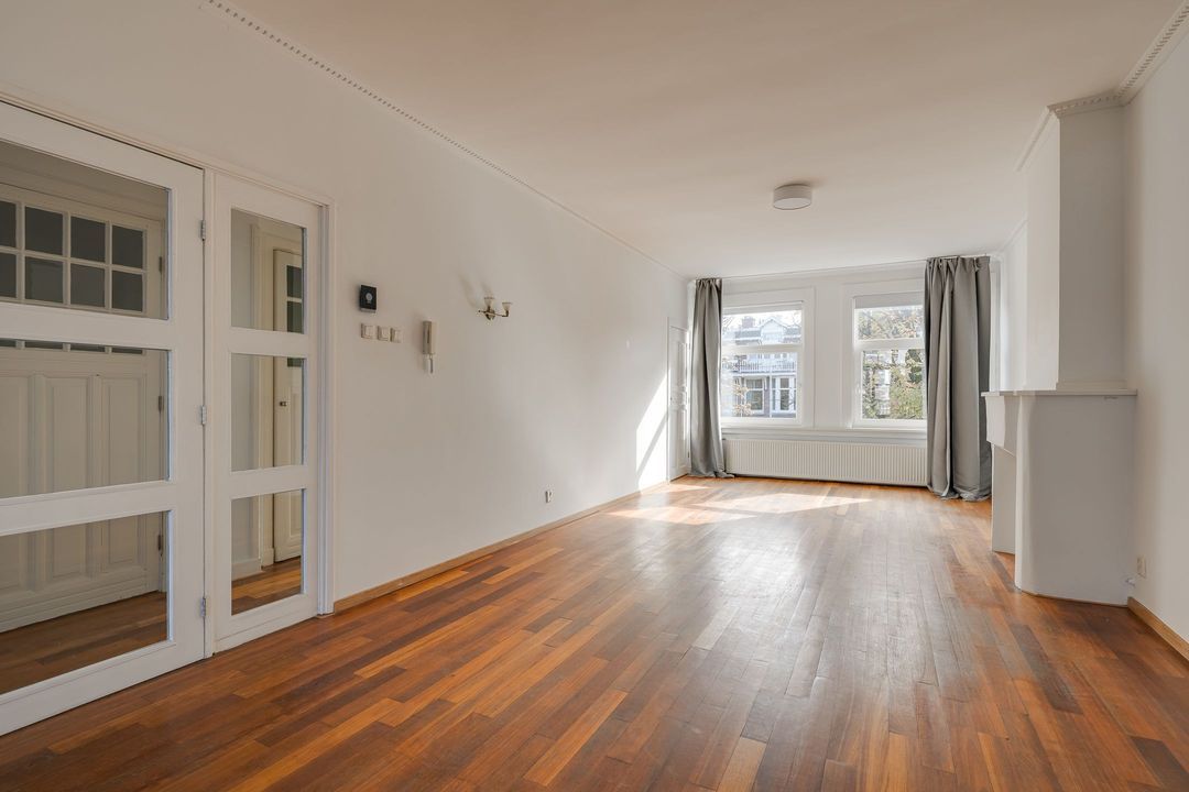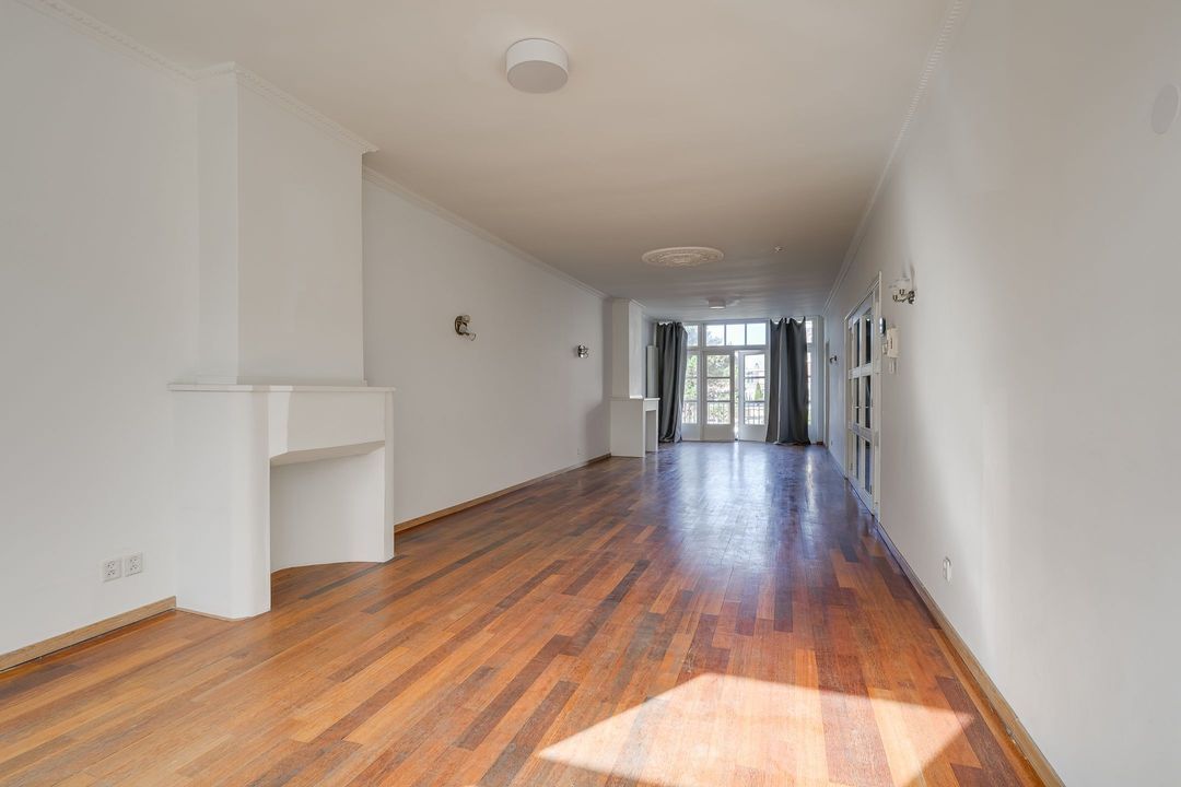 Entree via de voordeur; hal, binnentrap naar de eerste verdieping. Ruime overloop met royale doorgang naar de enorme woonkamer (14.21x3.80) met twee schouwen en mooie parketvloer. Aan de voorzijde uitzicht over de Laan van Meerdervoort, aan de achterzijde openslaande deuren naar het breed balkon (3.68x1.22) op het noordwesten.