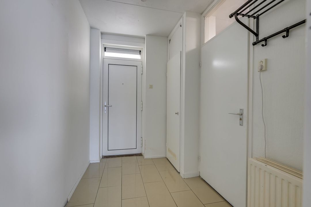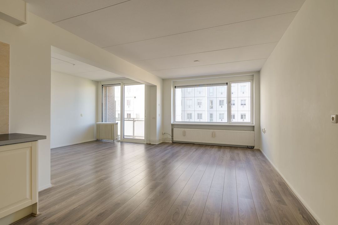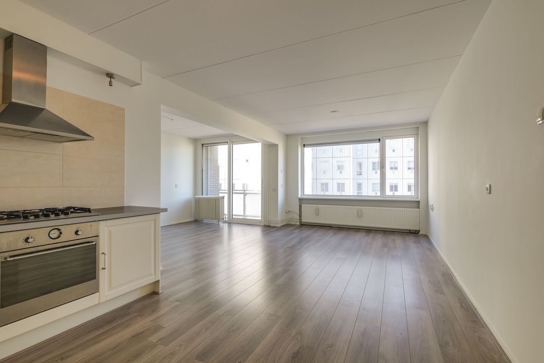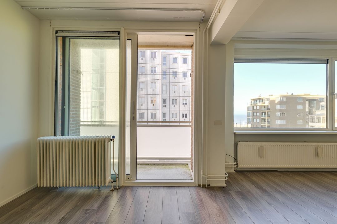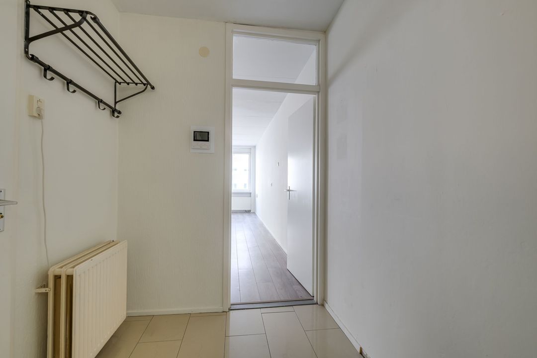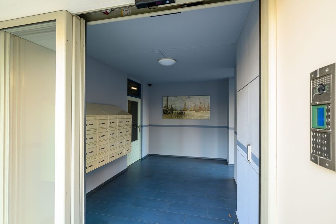 Via de gezamenlijke entree kunt u met de lift of via het trappenhuis naar de vijfde etage. Via de galerij met fraai uitzicht over Den Haag komt u bij het appartement, bij binnenkomst in de ruime hal met meterkast, treft u links de badkamer aan 1.5x2.8, deze verkeert in originele staat en is voorzien van een bad, wastafel, toilet, wasmachineaansluiting en de CV-ketel, woon- / eetkamer 6,4 x 4,4 m met een open keuken, voorzien van inbouwapparatuur, te weten oven, koelkast, vier pits gaskookplaat en afzuigkap, aansluitend via de schuifpui kunt u het balkon op het noordwesten met avondzon, aan de voorzijde betreden 2,8 bij 1,3 m. Vanuit hier kunt u een glimp van de zee opvangen.
