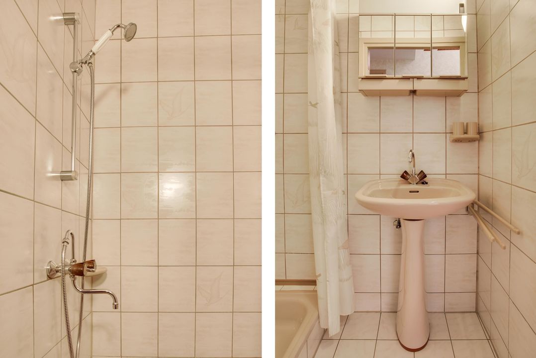 2e etage: grote voorkamer (4.29x3.70) doorlopend in achterkamer (4.3x1.5/3.5), 2e badkamer (2.5x1.9) met ligbad, toilet wastafel.