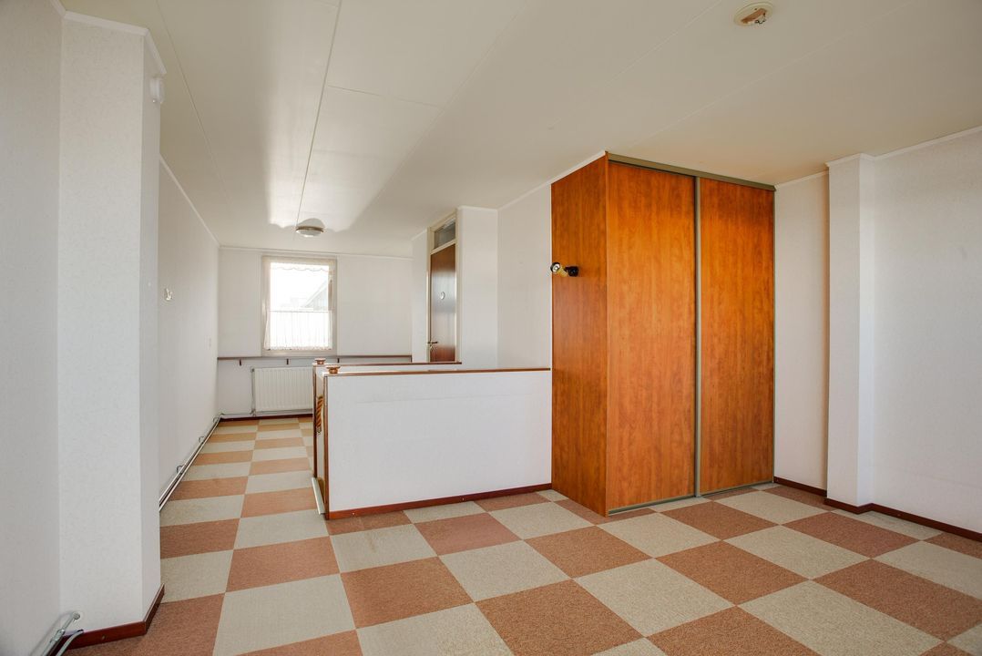1e etage: ruime overloop met, badkamer (1.8x1.0) met douche en wartafel, grote voorkamer (4.35x4.0) met vaste kast, achterkamer (4.00x2.36) en achter zijkamer (4.0x2.0).