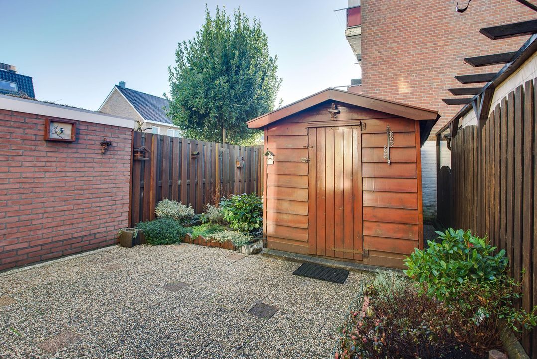 Voortuin (4.7x4.0), achtertuin (7.5x4.8) op het zuidoosten met houten schuur (2.8x1.8).