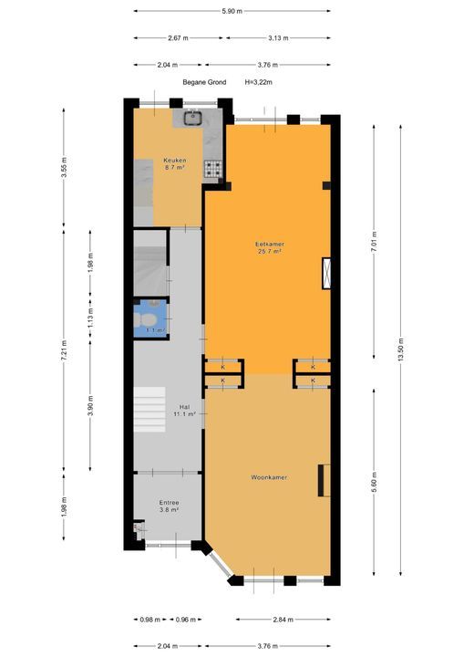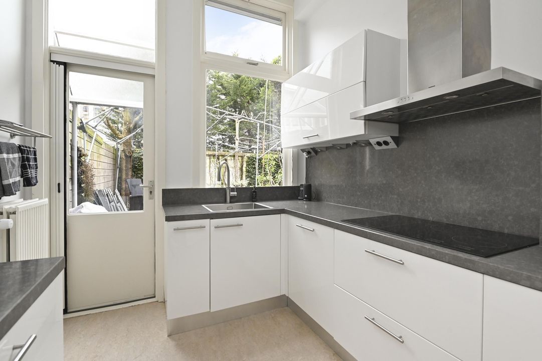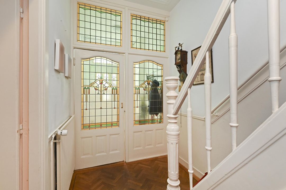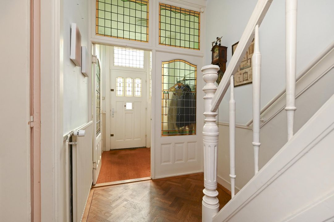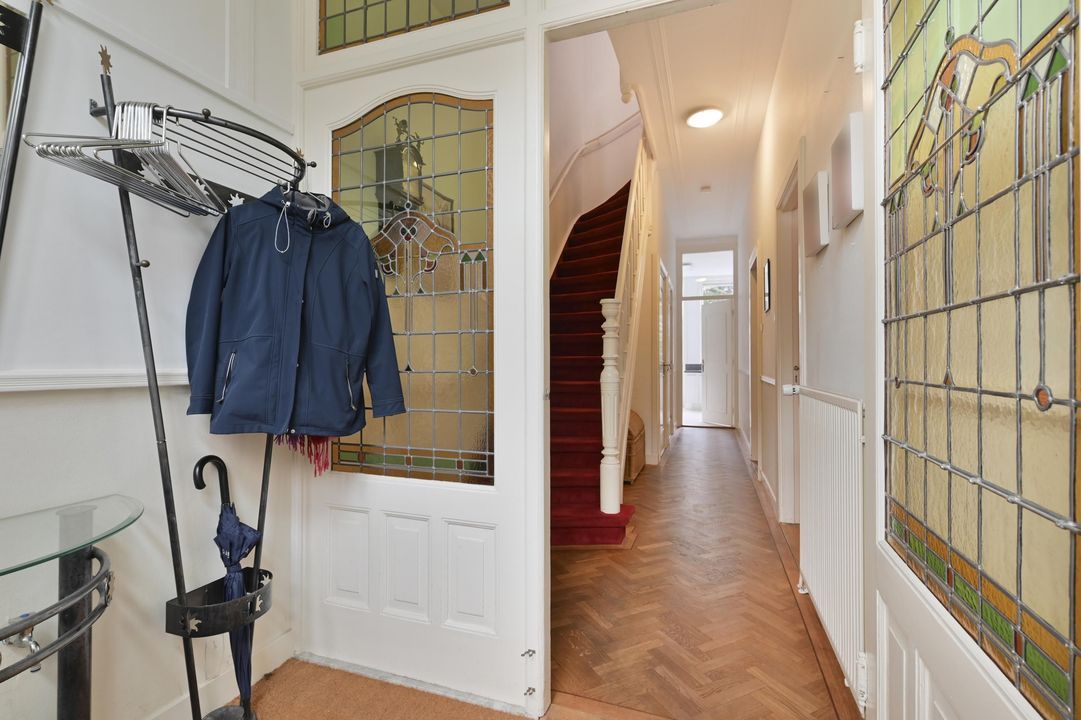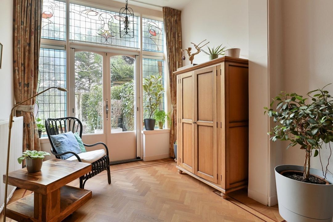 zonnige voortuin, entree, vestibule met ornamenten en prachtig glas in lood, gang met parket en een fraaie trappenhuis, toilet met fontein, voor-/achterkamer en suite 6.0 x 3.8 en 7.4 x 3.75 met massieve parket met bies en openslaande deuren naar de voor- en de achtertuin, prachtig glas-in-lood, originele plafonds en schouw met open haard, moderne keuken 3.6x2.5 met L-vormige keuken opstelling en een 2e keukenblok aan de andere zijde met inbouwapparatuur, te weten inductiekookplaat, RVS afzuigkap, koel-vries combinatie, vaatwasser, oven, een combioven en een Quooker met kokend, bruisend en gefilterd water, achtertuin 7.5x5.9 op het noordoosten met meer zon dan je denkt.