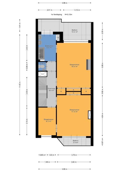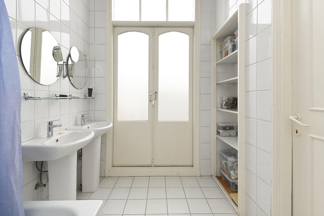 overloop, toilet met fontein, heerlijke zonnige voorkamer 4.6x3.8 met balkon, voorzijkamer 3.1x 2.0, achterkamer 5.1x3.8 met origineel plafond en inbouwkasten, eenvoudige badkamer 3.0x1.9 met ligbad en 2 wastafels, openslaande deuren naar achterbalkon (10m²) over de hele breedte.