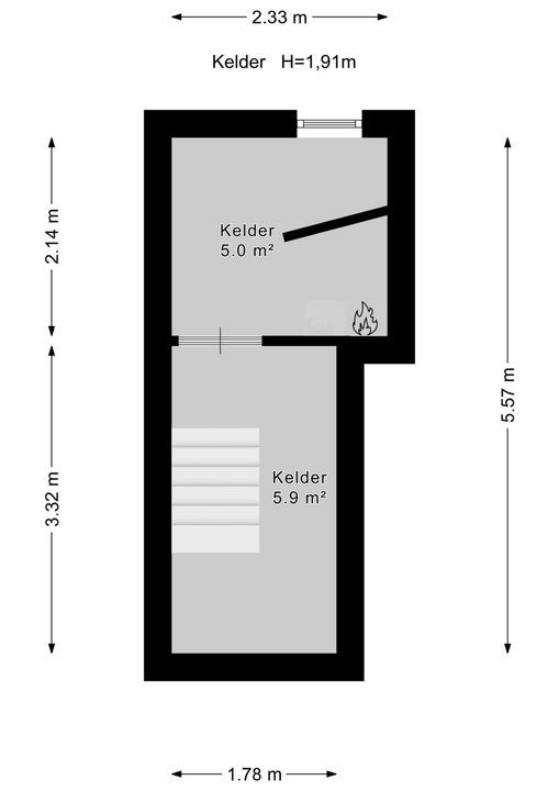 Kelder 3.3x1.8 en doorloop naar achter 2.14x2.3 breed.