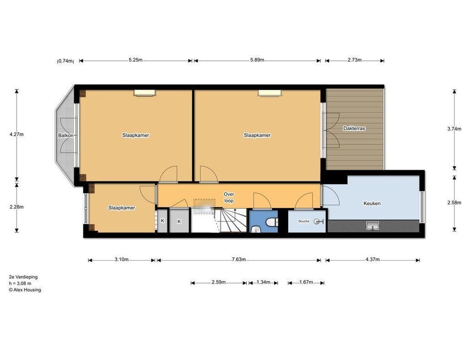 2nd floor: landing, room on the frontside (5.25x4.27) with a balcony, frontroom on the side (3.10x2.28), bedroom on the backside (5.89x4.27) with large balcony (2.73x3.74) on the sout-east, big laundryroom with washingmachine, dryer, washbasin and large working top, separate shower, toilet.