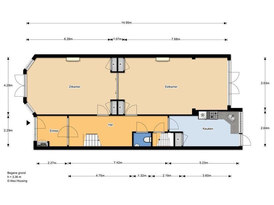 Ground floor: large entrance and hall, toilet, light and bright very large living-/dining room en suite (14.95x4.28) with partition doors and built in cupboards on both sides, new wooden floor, fully equipped kitchen (5.23x2.64) with all the necessary appliances and traditional built in cupboard, basement (6.34x2.54).