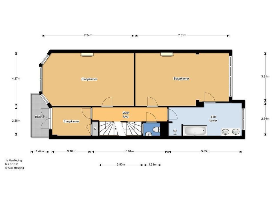 1st floor: landing, large bedrooms at the frontside (7.34x4.27) bedroom on the side (3.10x2.28) with balcony, huge bedroom on the backside (7.51x4.27/3.91) very large bathroom (5.85x2.64) with bath, separate shower, double washbasin, separate toilet.