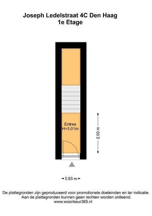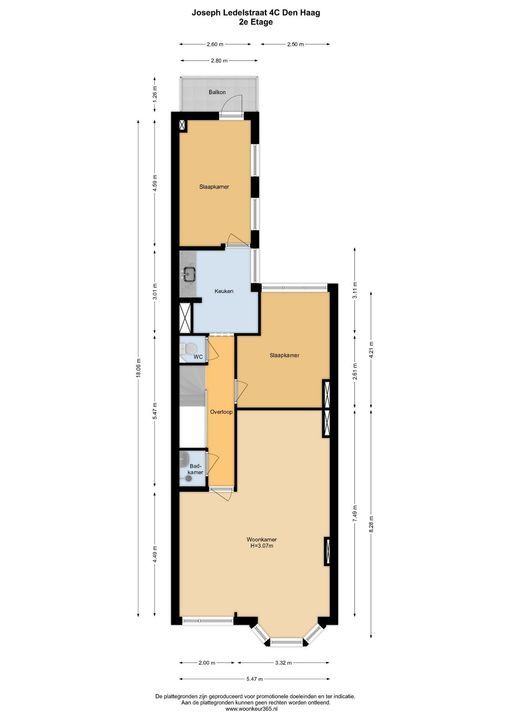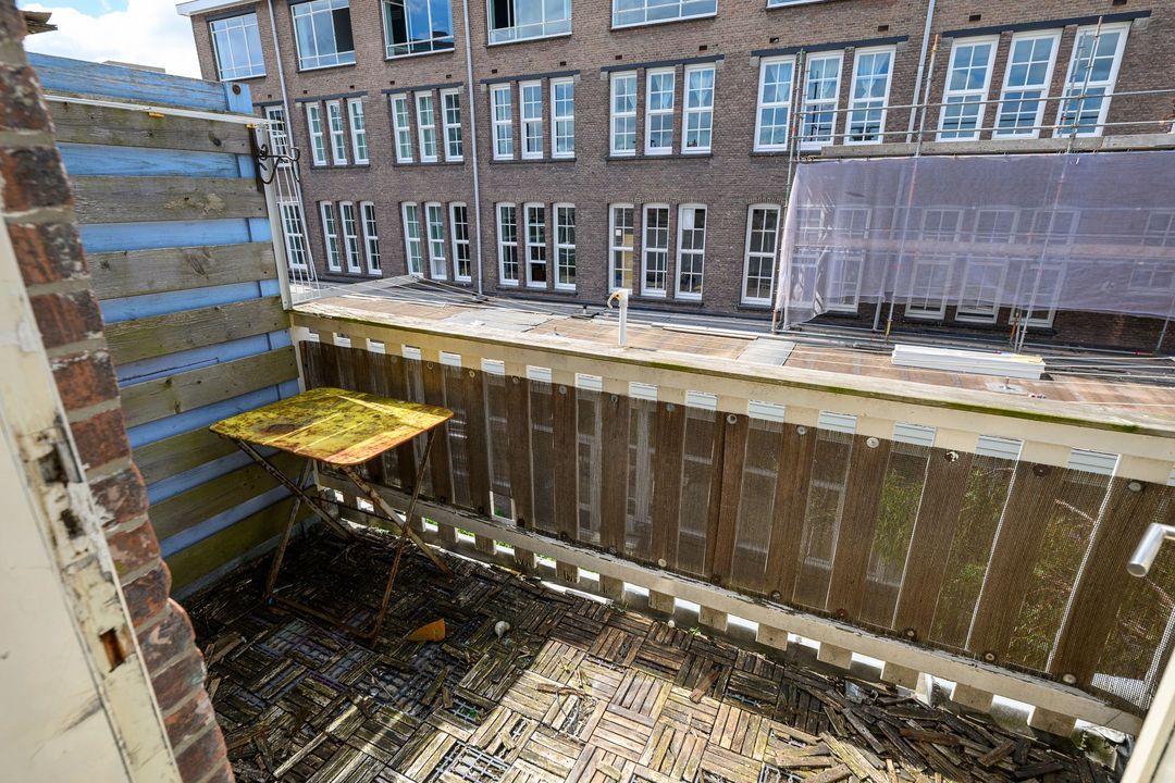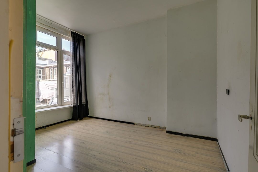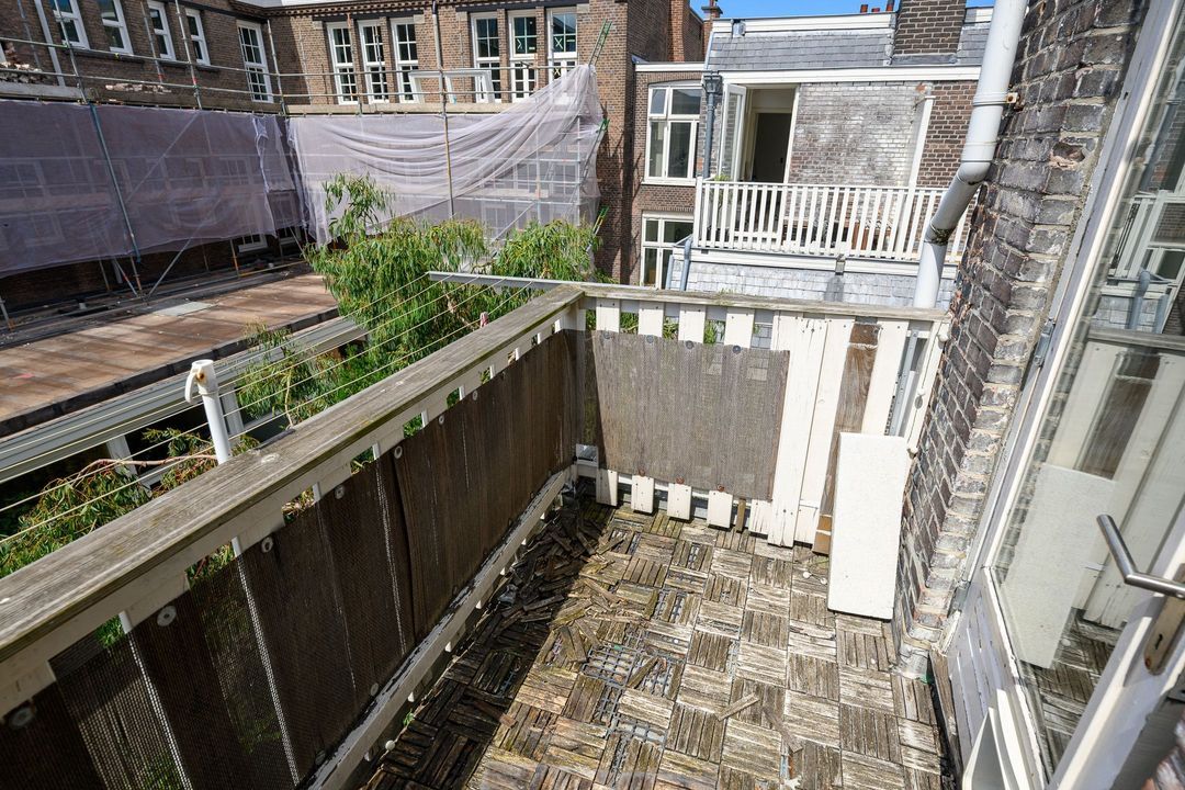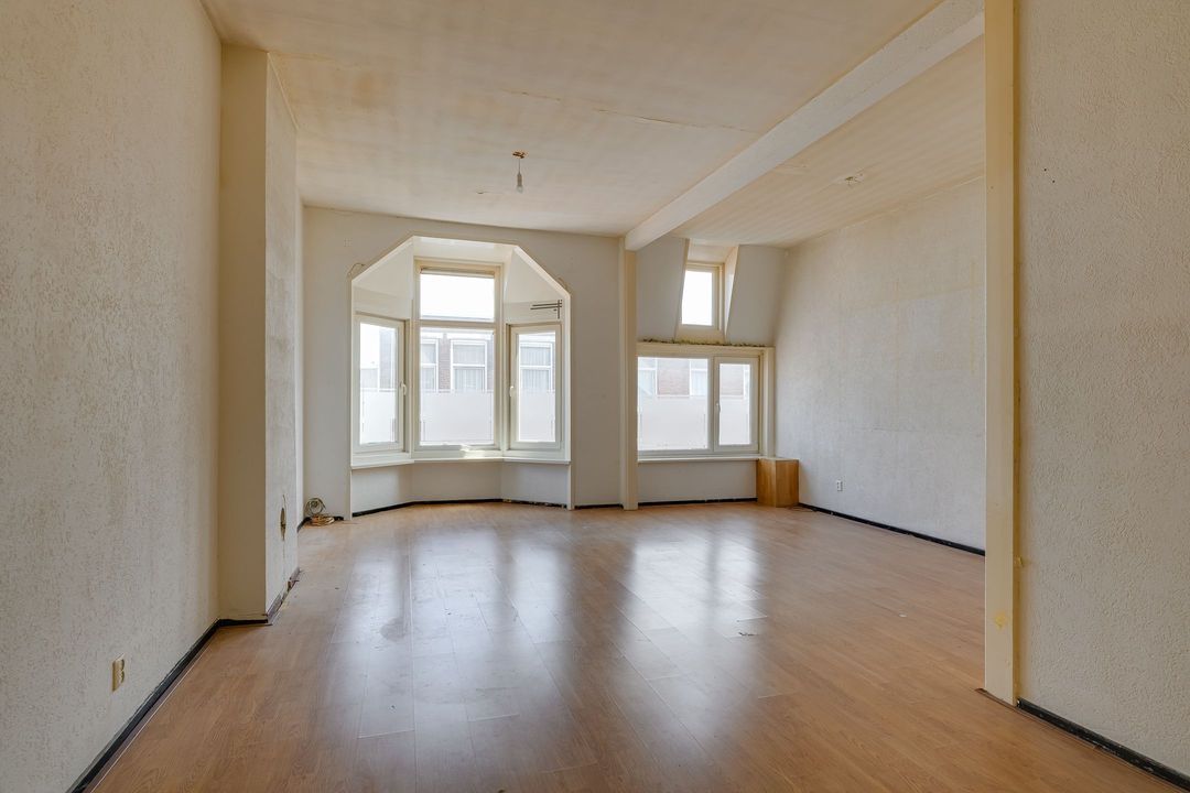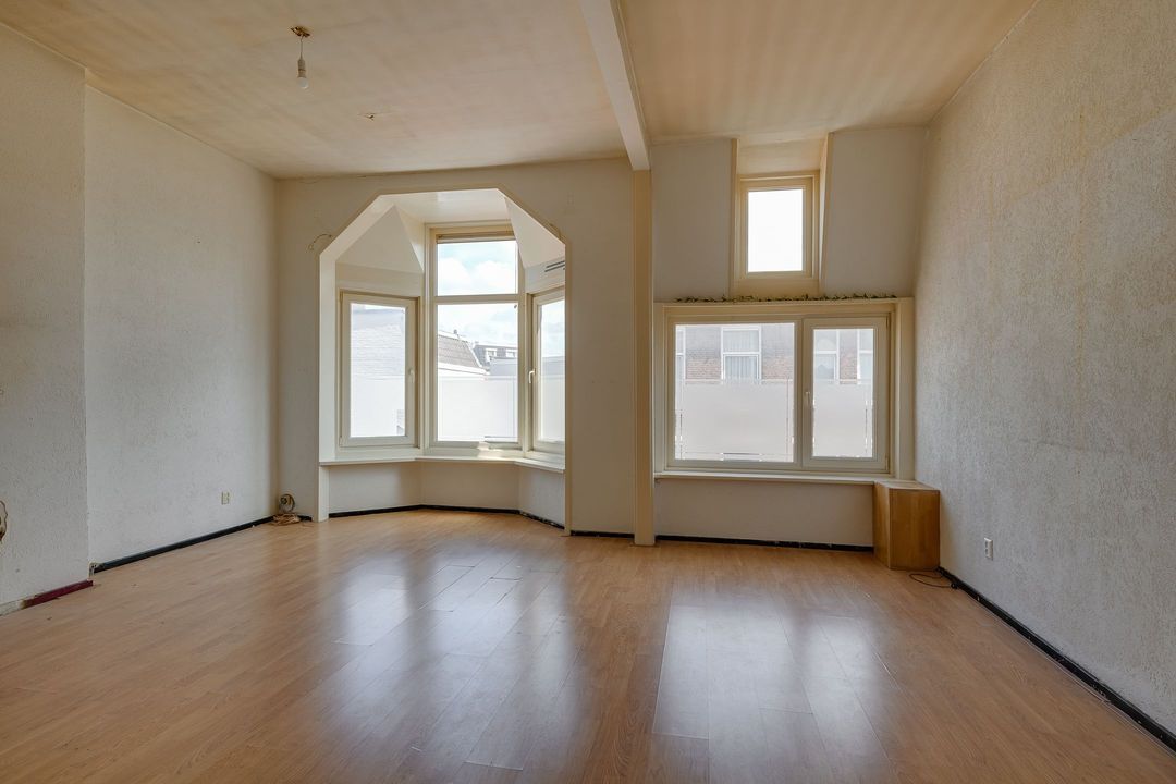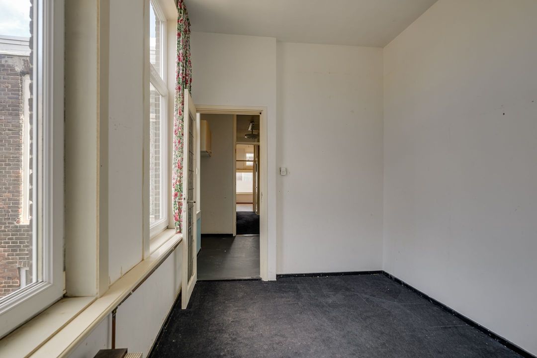 2e etage: overloop, grote L-vormige woon/eetkamer (8.28x3.32+4.49x2.00) met zeer hoog plafond (3.07m), doucheruimte met v.w., toilet, achterslaapkamer (4.21x3.32/2.5), ruime eenvoudige keuken (3.01x2.80), uitbouwslaapkamer (4.59x2.80) met toegang tot balkon (2.60x1.26) op het zuidwesten.