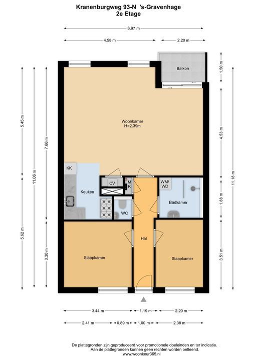 Gezamenlijke entree met brievenbussen, lift en trap naar de 2e etage, entree, gang met moderne toiletruimte , woon-/eetkamer over de breedte 7.0 x 5.5 met mooie vloer en open keuken 2.5x2.0 met inbouwapparatuur zoals een groot 6-pits gasfornuis, afzuigkap, vaatwasser en koel-vriescombinatie, balkon 2,2 x 1,6, badkamer 2,2 x 1,9 met douche, wastafel, wasmachine en droger, slaapkamer 3.4 x 3.3, 2de slaapkamer 3.5 x 2.4.