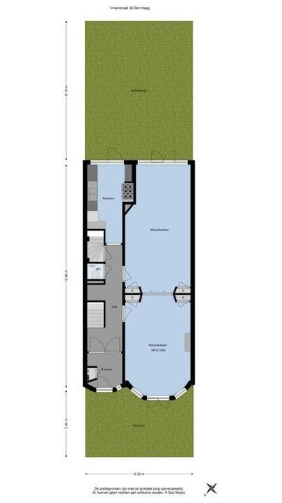 front garden with bike storage; entrance hall with granite floor, double doors to the hallway with cloakroom, modern toilet, living and dining room en suite 13.5x3.8/3.2 with parquet floors and fireplace (gas), modern kitchen 3.7x2.6/2.0 with Boretti stove with extractor hood, dishwasher, microwave, fridge and boiler, very sunny backyard 8.1x6.2 with beautiful porch and shed.