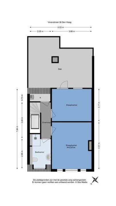 landing with toilet and small basin, cupboard with washing machine and dryer, very nice bathroom 3.7x2.6 with large shower , bath & double sink, bedroom in the back 6.4x3.85 with balcony, 2nd bedroom in front 5.0x3.85, 3rd room in the front 2.9x2.0.