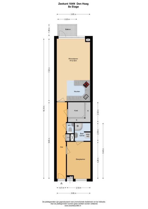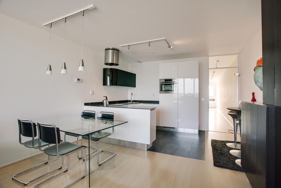 entree, gang, modern toilet, ruime woon/eetkamer (7.23x3.85) met luxe open moderne keuken voorzien van alle inbouwapparatuur, zoals el. kookplaat, afzuigkap, vaatwasser, koelkast en vriezer, toegang tot voorbalkon (2.23x1.35) met fantastisch uitzicht over de zee, strand en boulevard. Tussenkamer (2.32x2.72) te gebruiken als berging, walk-in closet of eventueel logeerkamer, ruime ouderslaapkamer (4.28x2.72) met toegang tot modern betegelde badkamer (2.32x2.72) met douche, wastafel en wasmachine aansluiting.