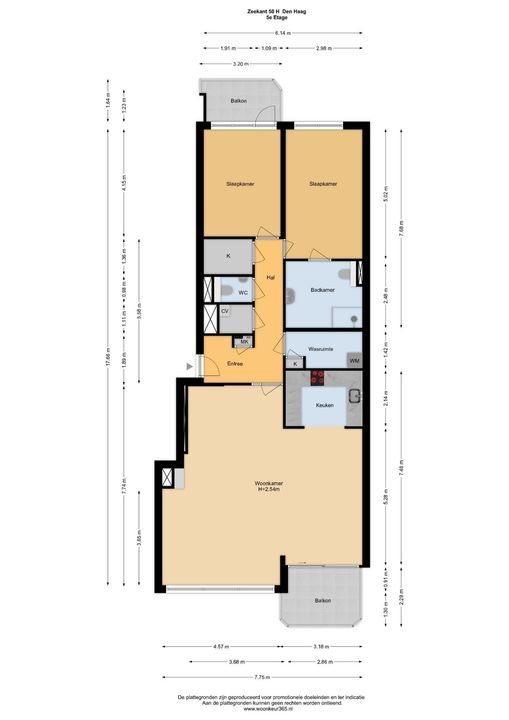 Communal entrance, hall with caretaker's office, lift and staircase to the 5th floor, small hall with access to 2 flats, entrance, L-shaped corridor with cloakroom, meter cupboard, storage room with central heating boiler, modern toilet with wall-mounted toilet and washbasin, utility room 3.0x1.4 with washing machine connection, spacious and comfortable living/dining room across the width 7.75x7.75/5.3 with great views over the boulevard, the beach and the North Sea with terrace 3.2x2.3 where you can enjoy the beautiful sunset, open kitchen 3.0x2.1 with U-shaped kitchen layout, plenty of storage space, a hard stone worktop and built-in appliances, namely induction hob, extractor hood, oven, microwave, refrigerator and dishwasher, spacious bedroom 5.0x3.0 with access to the bathroom 2.5x3.0 with shower, a beautiful washbasin unit and a wall-mounted toilet, 2nd bedroom 4.1x3.2 with access to the sunny rear balcony 3.0x1.6 with beautiful views over The Hague, spacious storage room 1.9x1.4 (former 2nd bathroom).